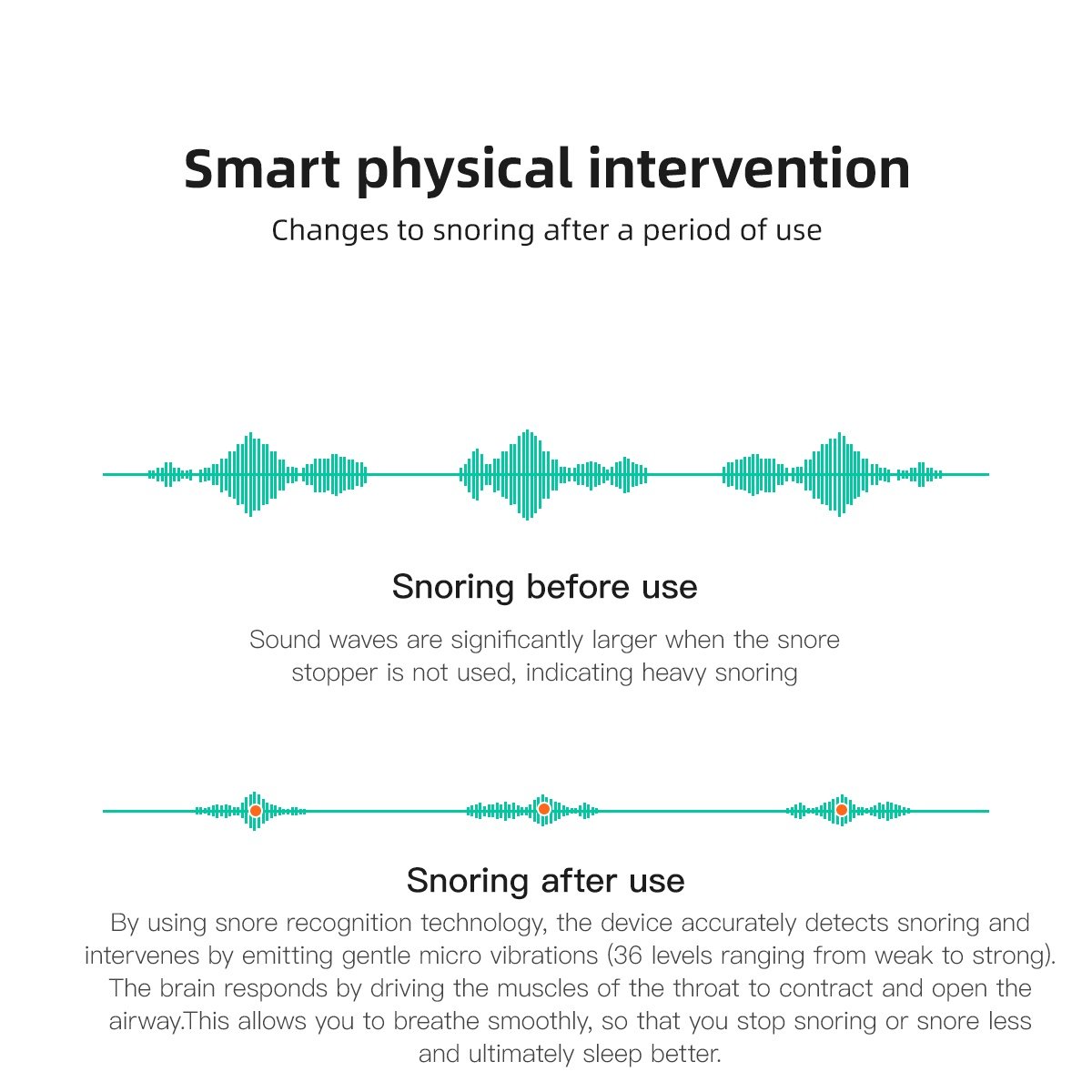When the snoring sound is recognized as snoring by the device, the device will vibrate and the vibration level will be adaptive. If the intervention of the current vibration level is unsuccessful, the vibration will increase step by step, reaching the highest level of snoring intensity set by the user. If the intervention is successful, the vibration level will be maintained; if there is no snoring for a long time, the vibration level will be reduced.